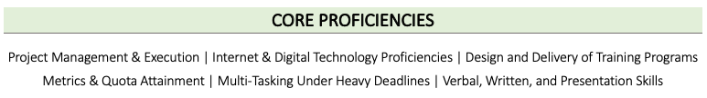 In this example, the skills are more detailed and complex. Since each skill takes up a different amount of space, a bullet point list would look messy and uneven. Instead, you can use a vertical bar key to separate each core proficiency. With this method, limit yourself to two or three lines of text to focus on the most essential of your proficiencies.