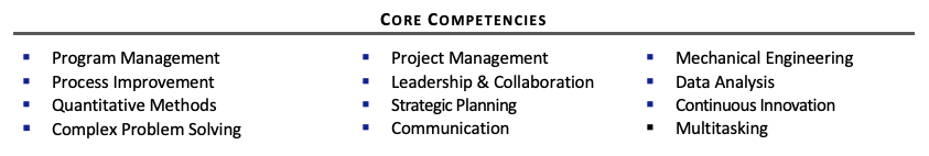 This list includes both soft skills and hard skills, so we've relabeled it "Core Competencies." Bulleted lists like these should be lined up. Limit yourself to 9 to 12 points so it doesn't look cluttered.
